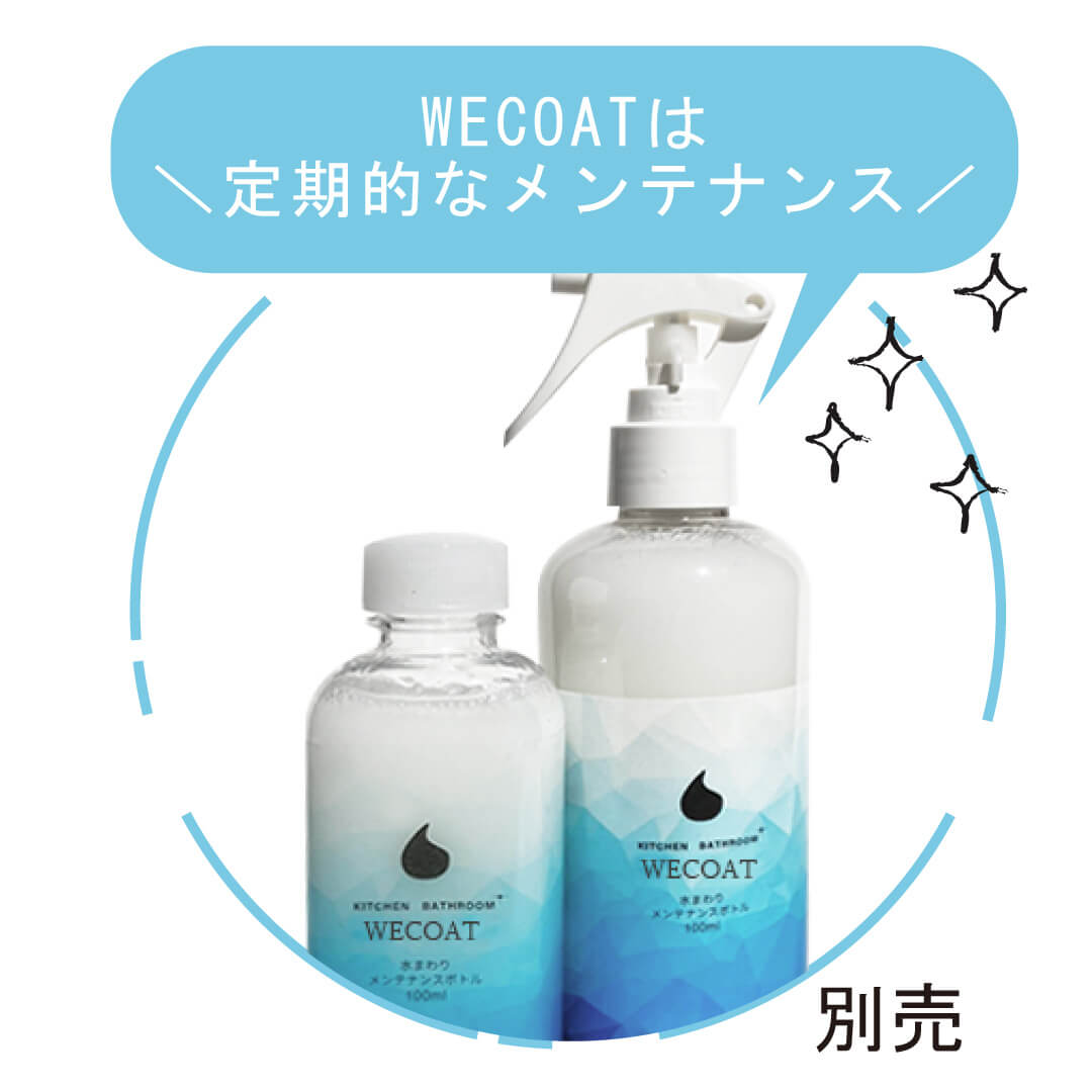 WECOAT(ウィーコート)専用、施工後のメンテナンスはメンテナンスボトルを販売しております。弱まってきたかな、と思ったら、車のワックスがけ同様に液剤を、円を描くように練りこむと再度効果を発揮いたします。ご自宅での定期的に、メンテナンスを行うことでキレイを保つ商品です。